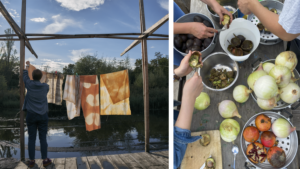 Textile practices at Floating have evolved over several years—emerging from the site itself through colors, materials, patterns, and use. One such lineage began in 2022 during the “Day of the Waste” program led by textile designer Garance Maurer. There, fabrics were naturally dyed using food scraps. These cloths were later used as tablecloths to serve a dinner prepared entirely with leftover produce from local markets.
