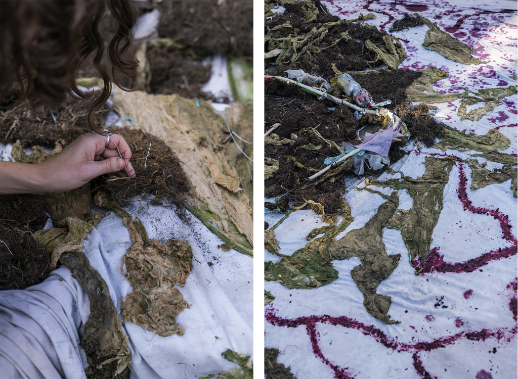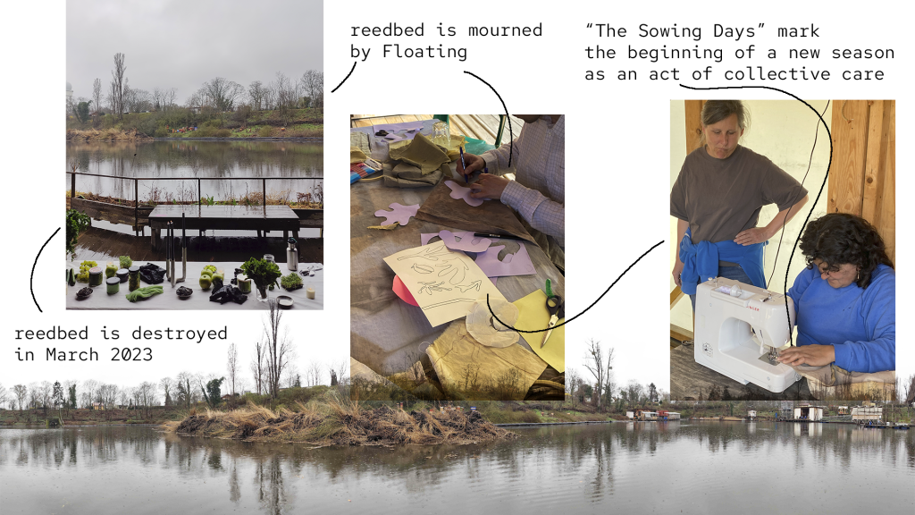 Over the winter, the dyed pieces were stored, only to be sewn together in spring by members of the association—a gesture of collective care and seasonal preparation to reopen the site, since the prominent riparian ecology of reeds has been cut down.