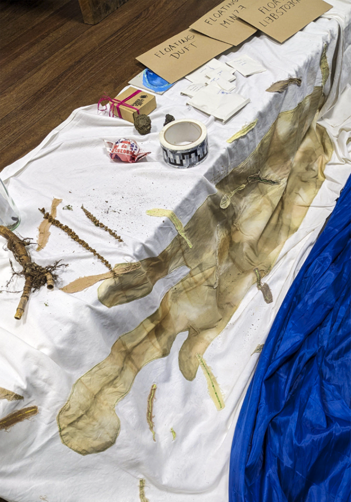 The tablecloth eventually came to show the outline of the reed bed destroyed in spring 2023. In autumn of that year, it travelled from Berlin to São Paulo, and then returned to Floating. During the Planetary Confluences festival in June 2024, we held an embroidery workshop atop the cloth. Soon after, it returned to São Paulo, where Solange and her group added new embroidery—stitching traces of riparian plants from the Saracura River. The cloth came back once again for an exhibition at Spore Initiative in Berlin in November 2024, and now rests at Floating University.