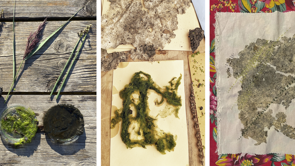 One embroidered piece tells the story of an algae collection: brought from Berlin to São Paulo after an exchange on embroidery as political practice, a single piece of algae was preserved on cloth. In summer 2024, the embroidered algae travelled back to Berlin, where, inspired by the Planetary Confluences festival, it was reworked into a riverine landscape.