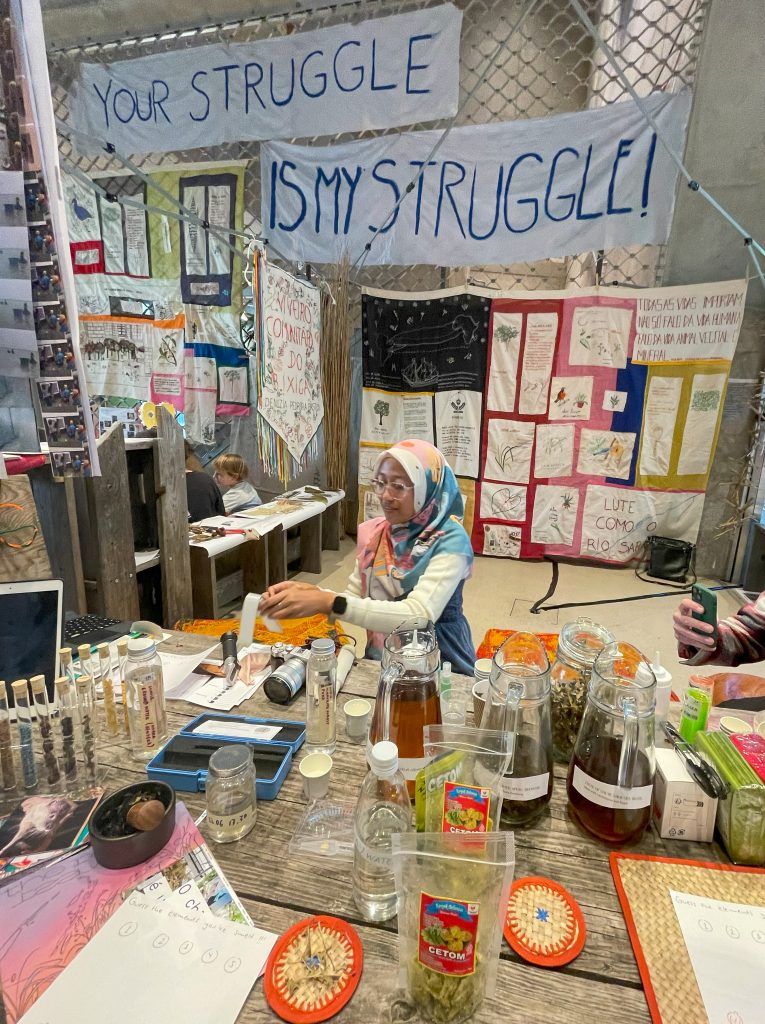 Visitors were invited to engage with evidence from water and river species from Jakarta, Berlin, and São Paulo. In the etalase (shop window), they explored images of our struggles presented in rencengan (sachet strip) format. At the meja lesehan (low bar tables), people carried out experiments, exchanged stories, and imagined new solidarities across rivers, cities, and worlds.