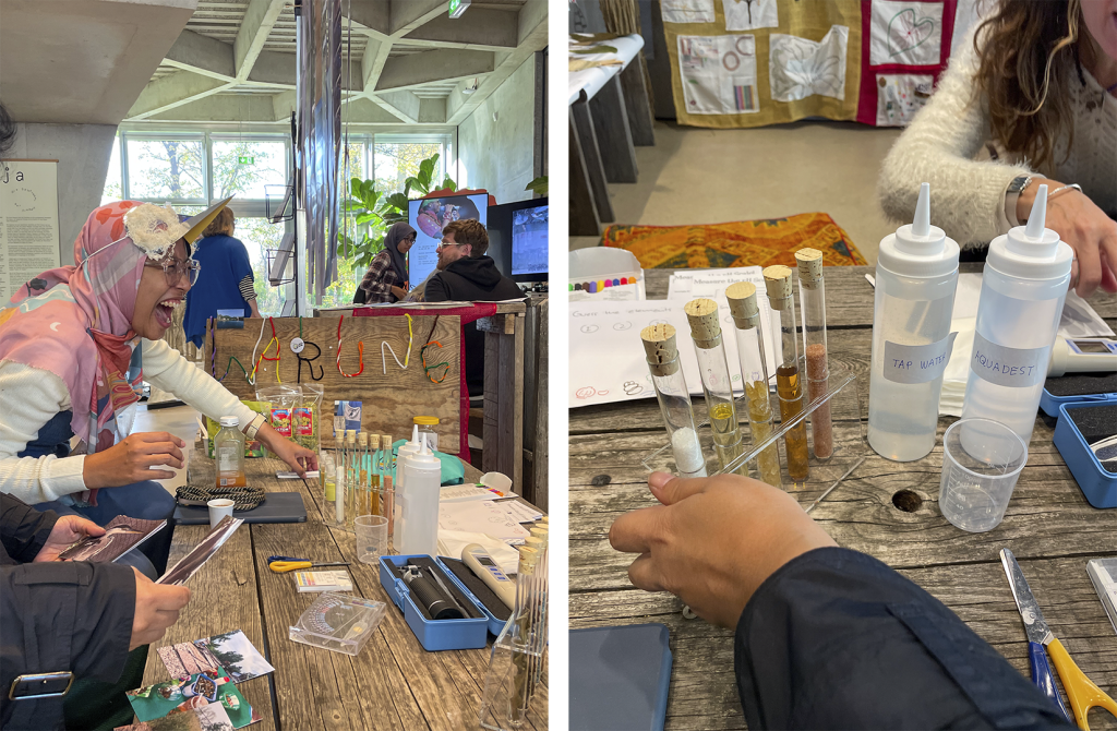 At Cozy Lab, participants learned how to conduct simple environmental tests in everyday settings. Novita and Mia collected leaves from trees around the venue, introducing modest lab methods to detect salinity, an indicator of contamination. The workshop highlighted elements in water linked to human activities, showing that pollution sensing can be both accessible and empowering.