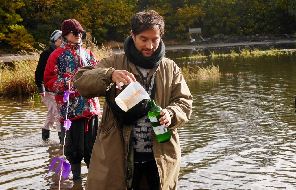 Water quality has been a recurring focus at Floating University, explored through multiple phases of testing and public engagement. As part of the project WEB – Water, Earth, and Biodiversity, scientists Katherine Ball and Martina Kolarek from the Floating team collected water and soil samples from the rainwater retention basin. These samples were analyzed in a laboratory, and the results were later shared online and discussed in public sessions, opening up scientific data to broader, collective interpretation. After this initial phase, regular testing paused for several years due to limited time and resources.